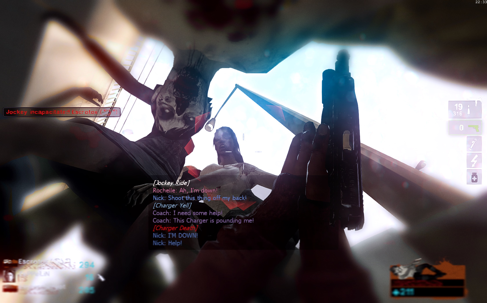 Still wandering the house, you can hear occasional footsteps of someone running, screeches of pain and muffled gunshots through the walls.