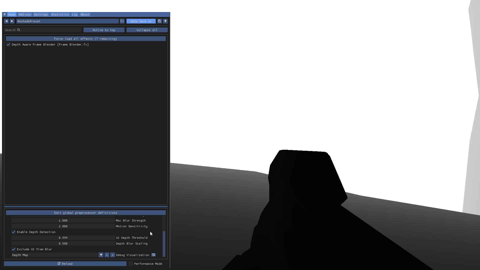 Frame Blender is fairly self explanatory but its important to disable all in-game post processing such as film grain or motion blur effects for the shader to work, DLSS and FSR4+ should work fine. if you check debug options and see the depth visible like the image below you are good.